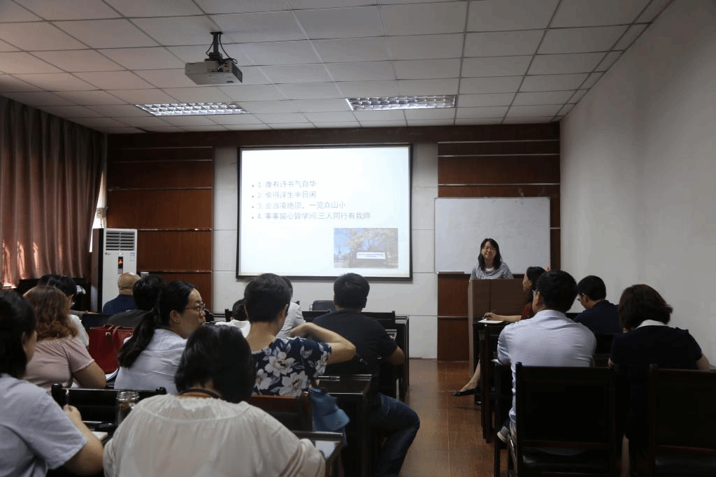张蔚老师用四句大家耳熟能详的中国诗句(“腹有诗书气自华”、“偷得浮生半日闲”、“会当凌绝顶、一览众山小”、“事事留心皆学问、三人同行有我师”)为提纲分享了她在美国的收获。她强调了读书的重要性,鼓励大家不断加强学习丰富自己,留心日常生活中的学问。在分享的最后,张蔚老师借用杨绛先生的一句话“用生活所感去读书,用读书所得去生活”作为分享的结尾,给大家留下深刻的印象。
