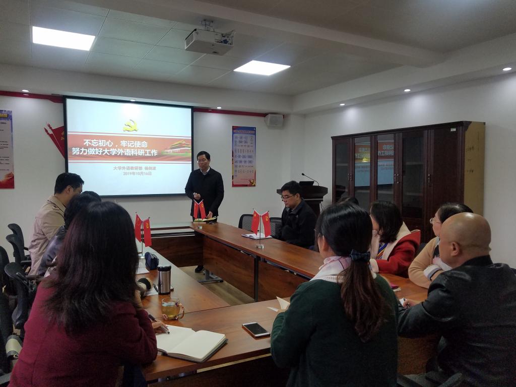 杨剑波同志围绕“不忘初心、牢记使命,努力做好大学外语科研工作”的主题,结合外语部工作实际,以学习习近平总书记重要讲话精神为出发点,从大学外语教师的初心和使命、习近平总书记对社科工作的重要论述和努力做好大学外语教研工作三个方面进行了阐述。他表示,教师是人类灵魂的工程师,教书育人就是教师永恒不变的初心和使命。做好教书育人的本职工作,提供优质大学外语教学,服务双一流,助力国际化是每个教师不容推卸的责任。在谈到科研工作时,杨剑波同志从大学外语科研工作要体现时代特征和中国特色、要解决现实问题、要坚持不断创新等方面,讲述了他对外语部科研工作的思考。杨剑波同志还特别强调了科研诚信的重要性和学术不端行为的严重性,希望党员能够发挥先锋模范作用,带头营造风清气正、诚信治学的学习和科研环境。