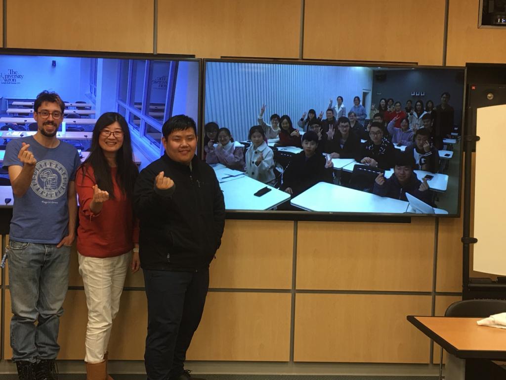 两组同学精心准备了小组报告,准备在AK论坛上分享自己完成小组任务的感受和体会。6:30,论坛正式开始,关合凤老师主持交流会,肯定了同学们克服困难准时赶到参与的积极性,并鼓励大家勇敢向美国阿克伦大学的同学们介绍中国文化,交流开心,有所收获。阿克伦大学孔子学院的郭闰老师在大洋彼岸热情地欢迎黄河文明的同学们参加AK论坛。