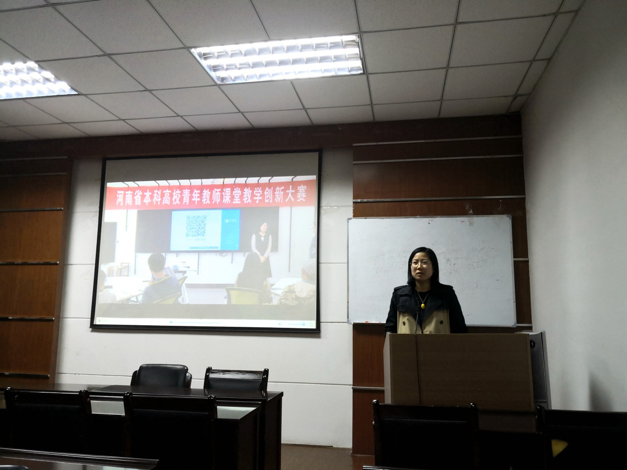活动伊始,谢菲给全体教职工介绍了在2019年下半年的各类教学竞赛中,外语部选派的参赛教师所取得的成绩。2019年7月,在河南省总工会、河南省教育厅联合主办的河南省教学技能大赛中,外语部教师郭皓荣获一等奖,并获“河南省教学标兵”称号。2019年10月,在教育部高等学校大学外语教学指导委员会、河南省教育厅和上海外语教育出版社联合主办的第十届“外教社杯”全国高校外语教学大赛河南赛区决赛中,外语部教师薛丽娜、王永亮分别荣获视听说组二等奖、综合组三等奖。2019年11月,在河南省教育厅主办的河南省本科高校青年教师课堂教学创新大赛中,外语部教师李冬青荣获文史哲法教组特等奖第一名的优异成绩,并受邀在颁奖典礼上做课堂教学现场展示。