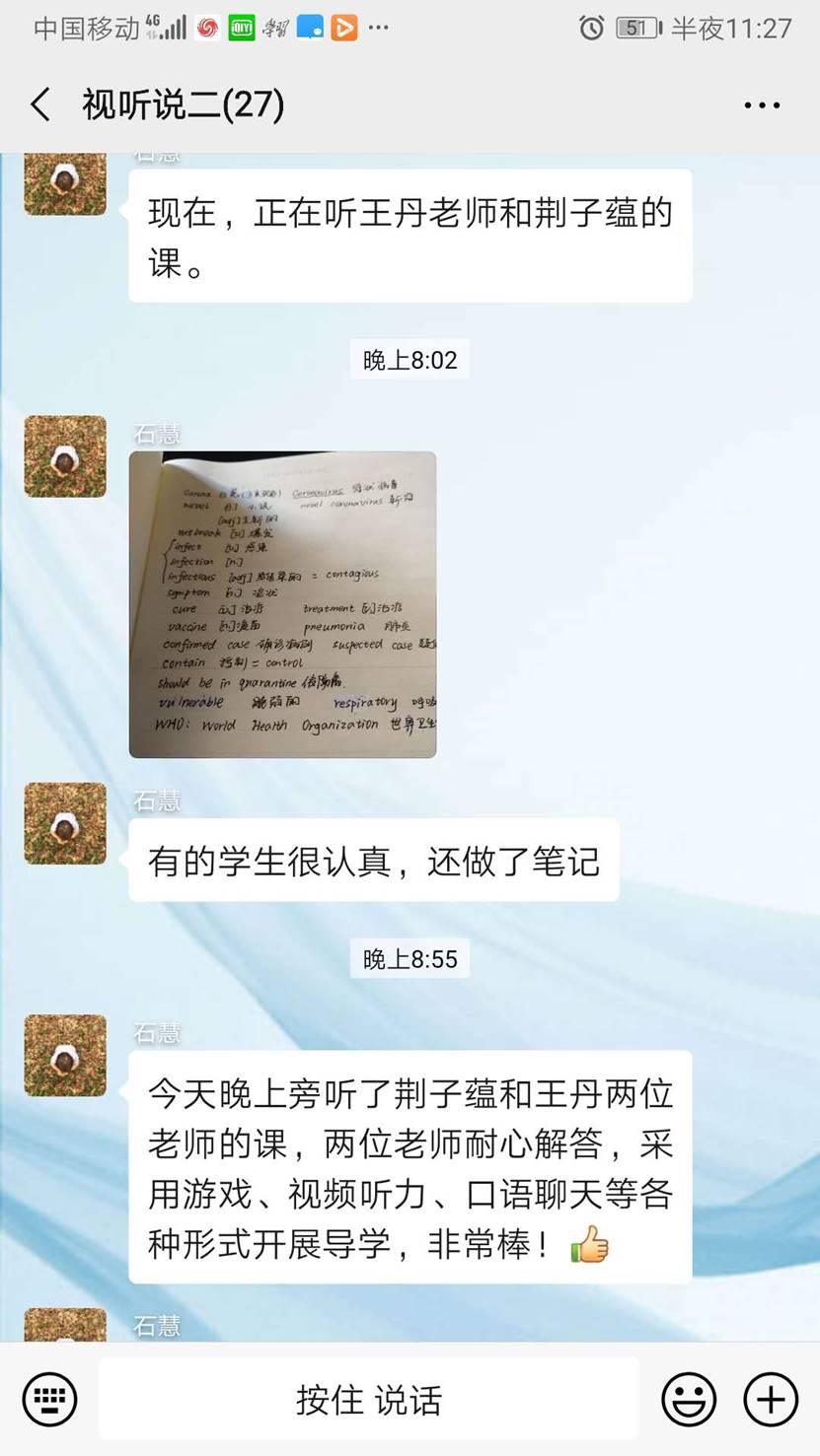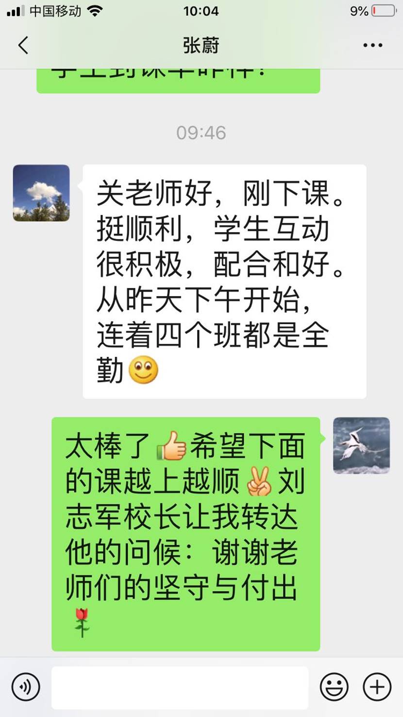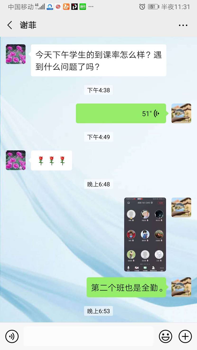 丰富的教学手段使得在线教学顺利开展,并保证了良好的教学效果。学生们对老师的工作表现出了极大的肯定和支持,课堂气氛活跃,互动交流顺畅。效果超出了老师们的预期。课后,很多老师顾不得吃饭就开始在教研室的群里分享第一次课的得失,大家一起反思总结,交流探索。