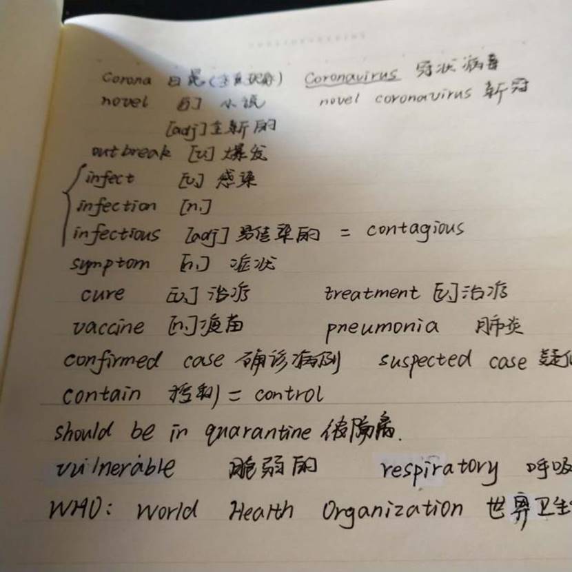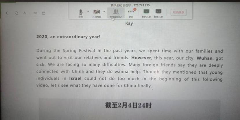 这是当天下午大学英语读写译课上,师小静老师通过腾讯会议给学生分析武汉疫情的英文报道。