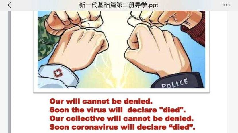 “Our will cannot be denied. Soon the virus will declare 'died'. Our collective will cannot be denied. Soon corona virus will declare 'died'. ”2月17日的大学英语视听说课上,郭皓老师正通过钉钉直播,给同学们分析网络上流行的“众志成城,消灭疫情”用英语翻译的一种方法。