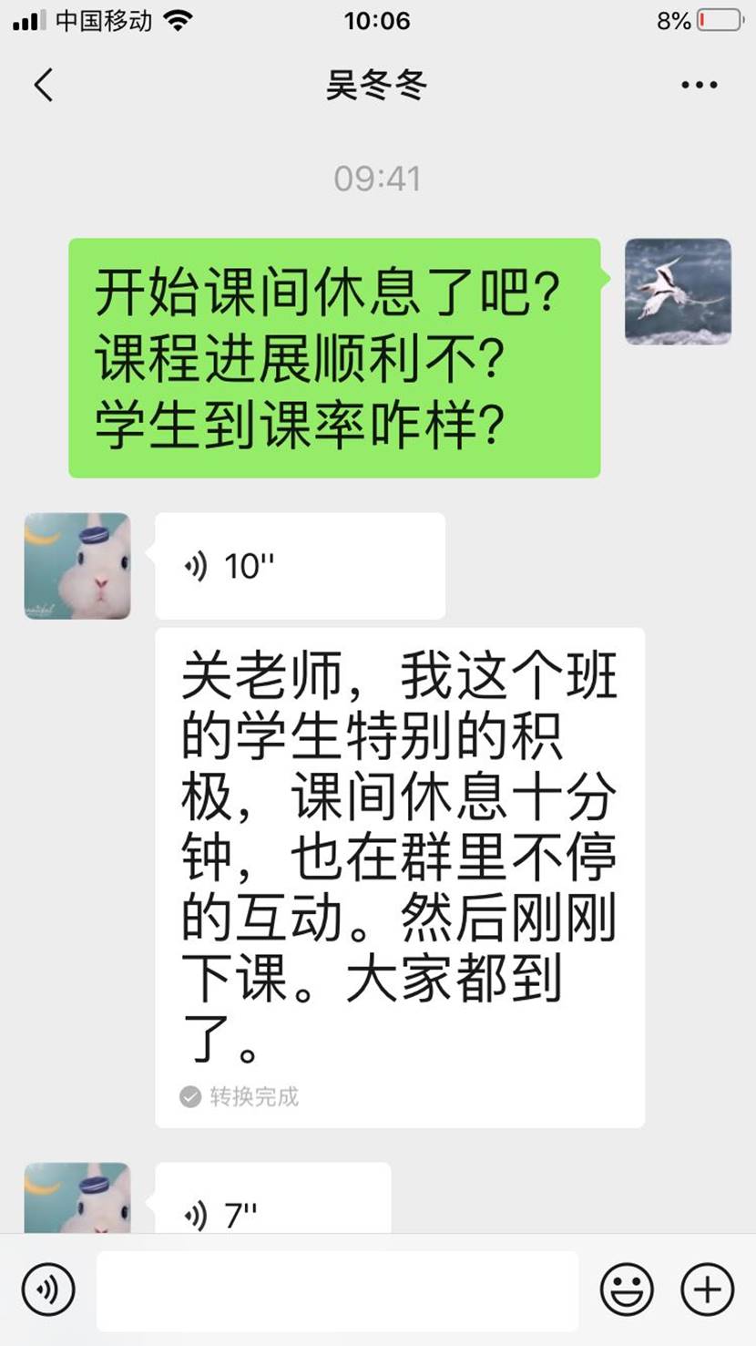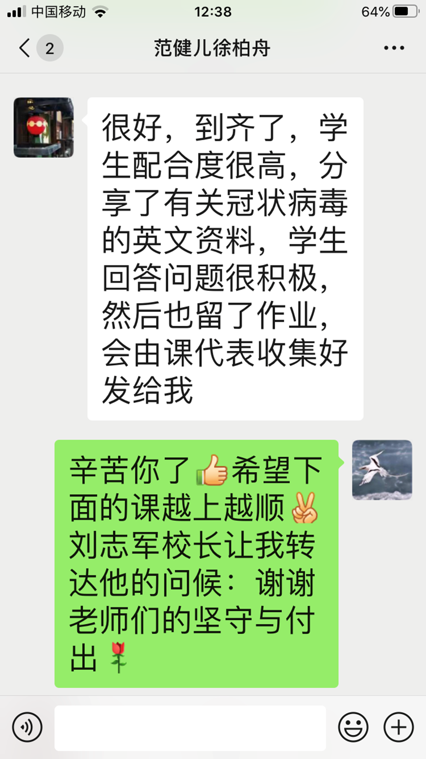 在课间休息的时候,外语部党总支书记、主任关合凤协同副主任谢菲带领教务办的同志们跟所有上课的老师一一联系,登记学生出勤率,询问第一次在线上课的开展情况,并向老师征求对线上教学的意见和建议。各教研室主任也在老师上课期间,不定时的进入教师上课的直播间或教学群,对教师的上课情况进行网上督导检查。