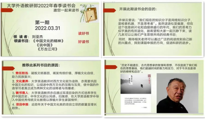 如何巧妙地将思政元素融入大学英语教学,如何深入全面地完成立德树人的根本任务,一直是spbo即时比分 的各位领导与全体教师共同关注的问题。考虑到外语学习者往往是两种文化的诠释者与传播者,spbo即时比分 尝试以读书会的方式在博大精深的中华优秀传统文化中寻找答案,力求通过中西文化的互镜与互竞加强文化自信,厚植家国情怀。