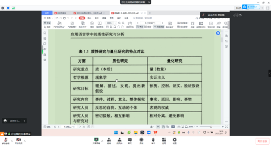 2023年3月17日下午,spbo即时比分 第二期教师共同体“应用语言学中的质性研究与分析”读书会在领读薛丽娜老师的带领下,进行第一次分享活动。共同体成员们围绕共读书目《应用语言学中的质性研究与分析》的前两个章节进行了分享和讨论。
