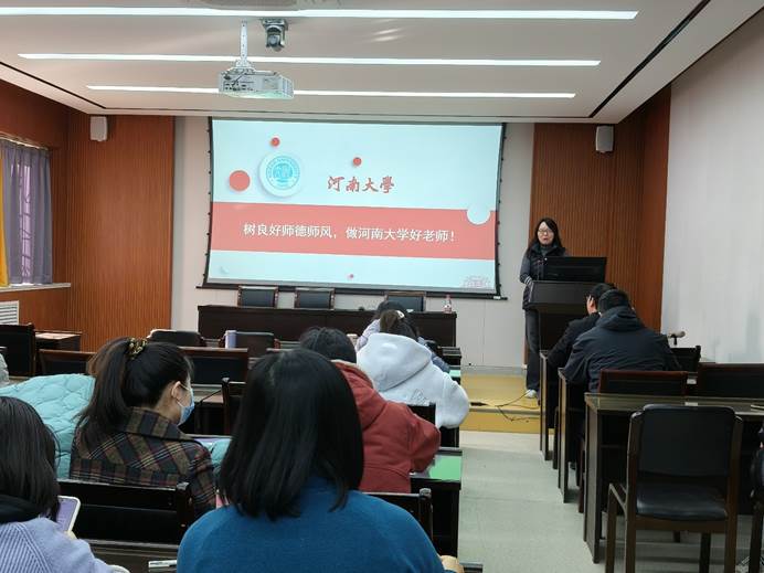 赵炎以《树良好师德师风,做河南大学好老师》为题,从三个方面对此进行阐述。首先赵炎通过习近平总书记的重要论述引出加强师德建设的重要性和必要性。随后又结合了近年来教育部公开曝光的高校师德失范典型案例,对《关于高校教师师德失范行为处理的指导意见》《河南大学教师师德失范行为处理办法》进行介绍,对此,她强调师德失范具有一票否决权,对于师德违规问题绝对零容忍,必须进行严肃处理。最后赵炎通过调查数据的展示,说明了要做什么样的好老师,全体教师应做到严守师德红线,立德树人。