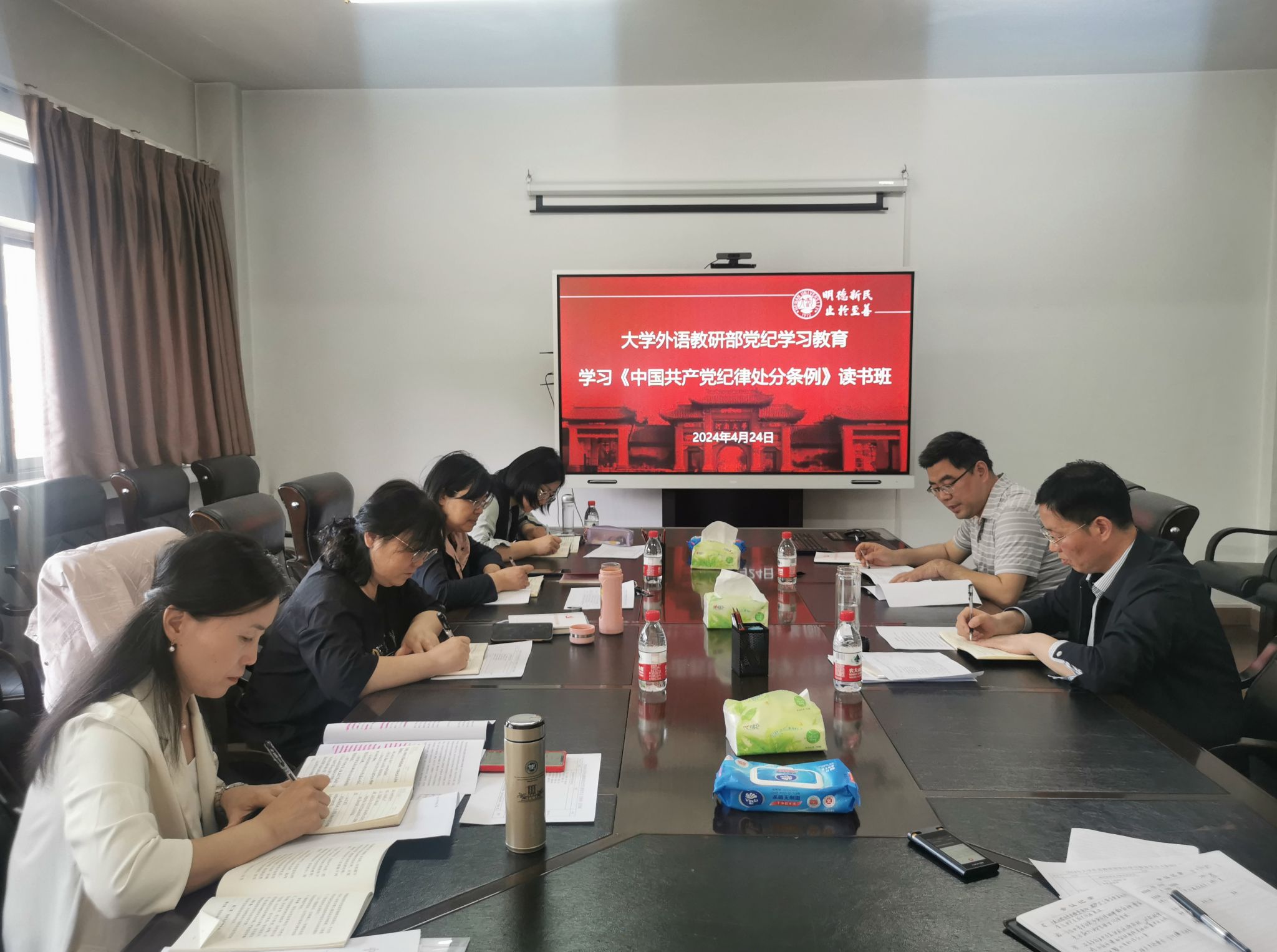 4月24日上午,spbo即时比分 党纪学习教育学习《中国共产党纪律处分条例》读书班在部211会议室开班,此次学习由部党委副书记、副主任蒋框主持,党委理论学习中心组成员参加学习研讨。