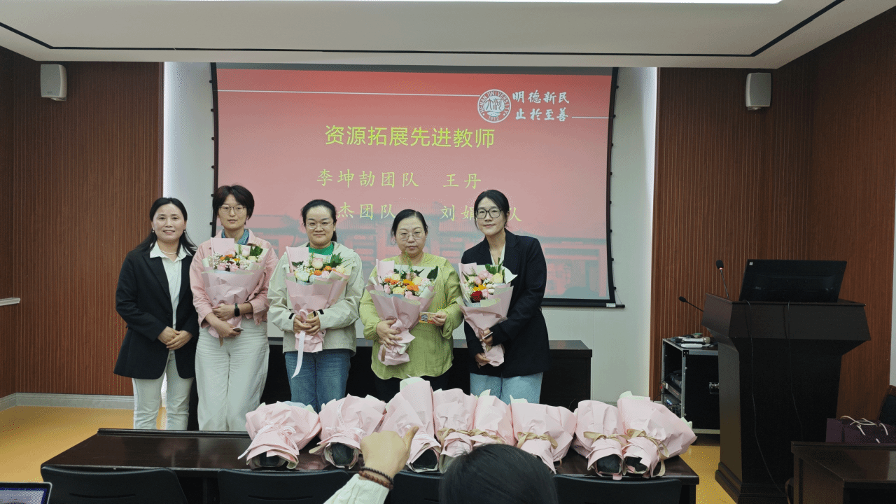 大会对在资源拓展工作中做出重要贡献的教师进行了表彰。李坤劼团队、王丹、喻杰团队、刘娟团队荣获“资源拓展先进教师”称号,部副主任白玉杰为获奖代表颁发了鲜花和奖品,感谢他们为大外部拓展发展空间、争取外部资源所做的辛勤努力。