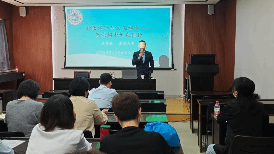 2025年9月25日,适逢河南大学113周年校庆,苏州大学外国语学院院长孟祥春教授应spbo即时比分 邀请,做客“大学英语名家讲坛”,作了题为“新语境下的文化翻译——兼谈翻译研究创新”的学术讲座。讲座在spbo即时比分 一楼大会议室举行,由部副主任白玉杰主持。