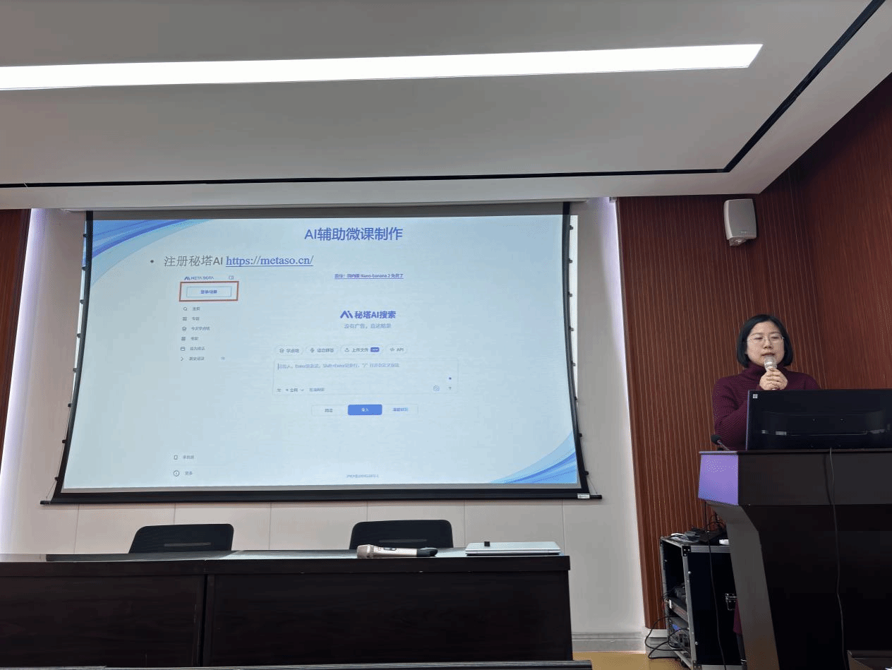 随后,李冬青老师结合自身在学术英语课程智慧化建设中的探索实践,围绕AI技术在教学中的实际应用展开详细讲解。她重点分享了如何运用AI工具系统梳理知识点、构建完整知识体系,打破传统教学中知识点碎片化的局限,并现场演示了AI辅助微课制作的完整流程——从脚本设计、素材剪辑到成品输出,步骤清晰、实操性强,让在场教职工直观感受AI技术为教学工作带来的便捷与高效。