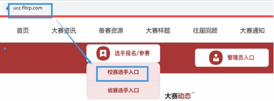 1. 请务必在浏览器输入大赛官网网址 ucc.fltrp.com(不可百度模糊搜索),在主页点击“选手报名/参赛”—“校赛选手入口”进行登录。