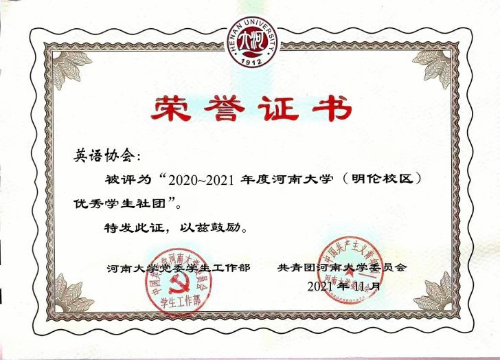 2021年英语协会被评为“2020~2021年度河南大学(明伦校区)优秀学生社团”